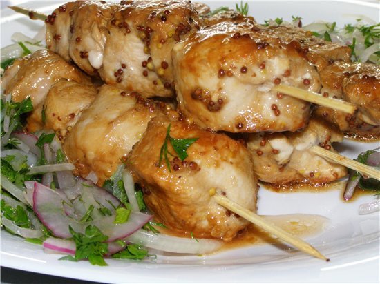 Описание: ШАШЛЫК ИЗ КУРИЦЫ В ДУХОВКЕ ИНГРЕДИЕНТЫ:● Филе курицы — 2 Штуки● Растительное масло — 2 Ст. ложки● Чеснок — 2 Зубчика● Сахар — 1 Ст. ложка● Кориандр — 1 Ст. ложка (сухой или свежий)● Соевый соус — 1 Ст. ложка● Перец чили, соль — По вкусу ПРИГОТОВЛЕНИЕ: Филе нарезаем и нанизываем на шпажки. Опускаем в маринад, который готовим из: растительного масла, сахара, кориандра, соевого соуса, выдавленного чеснока, соли и перца.Маринуем 2 часа.Разогреваем духовку до 200 градусов. Шашлычок укладываем в форму и готовим 20 минут.(один раз переворачиваем шпажки)Шашлычок получается красивого золотистого цвета.Приятного аппетита!
