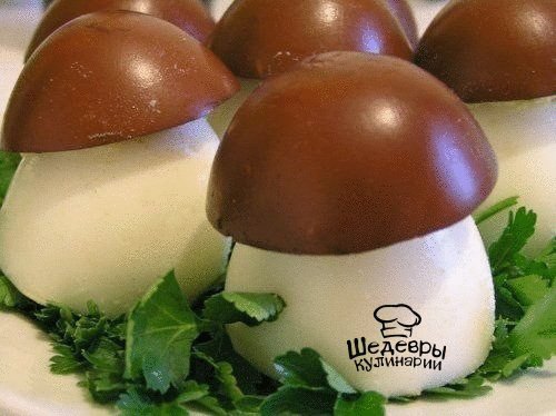 Описание: ИНГРЕДИЕНТЫ: вареные яйца баночка печени трески (можно и шпроты использовать запросто, но с печенью нежнее получается) майонеза чуть-чуть, где-то 1 ч.л. зелень для украшенияПРИГОТОВЛЕНИЕ:Итак, берем вареные яйца и разрезаем их так, чтобы получилось 2 части: 2/3 (тонкая часть) и 1/3 (более толстая часть). Меньшая часть - это будет шляпка нашего гриба. Большая - ножка. Вынимаем из половинок яичный желток в отдельную мисочку.Далее делаем крепкий чай и кидаем туда наши шляпки и даем им покипеть в заварке минут 10-15. Чай придаст нашим шляпкам коричневый цвет. На вкус это никак не повлияет.Пока шляпки коричнивеют, займемся начинкой. Для этого добавляем к желткам печень трески и майонез. Все перемешиваем с помощью вилки.Затем фаршируем наши "ножки". Если от желтка осталось маленькое отверстие, то можно аккуратно ножом увеличить его. Наши грибочки готовы.Приятного аппетита!
