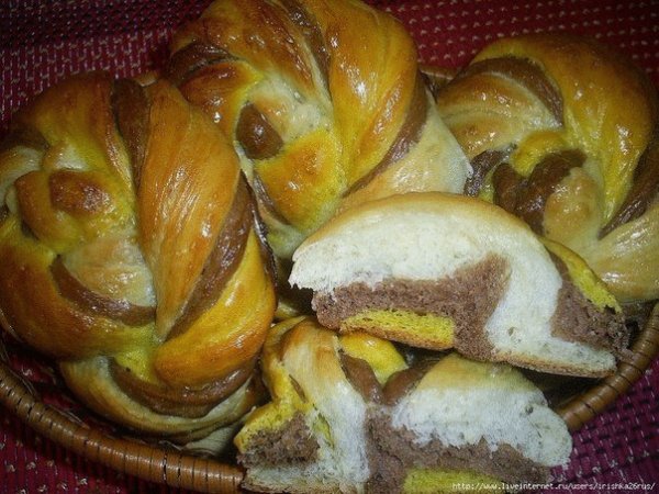 Описание: Красивые и вкусные цветные булочки "Веселая карусель"Ингредиенты:Тесто 1-80 мл кефира,-1/3 ч.л. соли,-1,5 ст.л. сахара,-1/3 ч.л. разрыхлителя,-4 ст.л. растопленного маргарина,-8 г живых дрожжей(4г сухих),-1 яйцо+2 стакана муки.Замесить тесто и хорошо вымешать.Тесто 2-80 мл кефира,-1/3 ч.л. соли,-1,5 ст.л. сахара,-1/3 ч.л. разрыхлителя,-4 ст.л. растопленного маргарина,-8 г живых дрожжей(4г сухих),-1 яйцо+2 стакана муки( без 2х столовых ложек) +2 ст.л. какао. Замесить тесто и хорошо вымешать.Тесто 3-100 мл тыквенного пюре,-1/3 ч.л. соли,-1,5 ст.л. сахара,-1/3 ч.л. разрыхлителя,-4 ст.л. растопленного маргарина,-8 г живых дрожжей(4г сухих),-1 яйцо+2 стакана муки.Замесить тесто и хорошо вымешать.Приготовление:1. Сделать колобки и положить в холодильник на 12 часов. Вынуть из х-ка, дать немного согреться. Раскатать пласт, смазать раст. маслом и посыпать сахаром, сложить все 3 пласта.2. Разрезать роликом с фигурным ножом или просто ножом, скрутить три слоя теста спиралью.3. Из скрученной полосочки сформовать булочку. Это же проделать и со всеми полосочками. Дать подойти, смазать взбитым яйцом и выпекать при низкой температуре, а потом Т повысить.4. После выпечки смазать сиропом.
