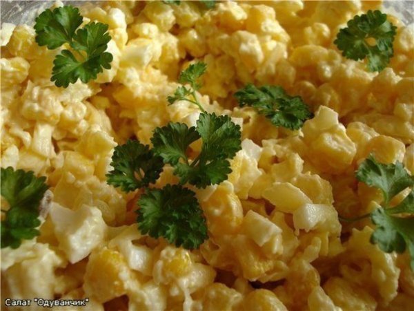 Описание: Салат “Одуванчик”150—200 г сыра,1 банка кукурузы,3—4 яйца,лимонный майонезСыр натереть на крупной терке, сваренные вкрутую яйца нарезать кубиками, добавить кукурузу, майонез по вкусу и перемешать.