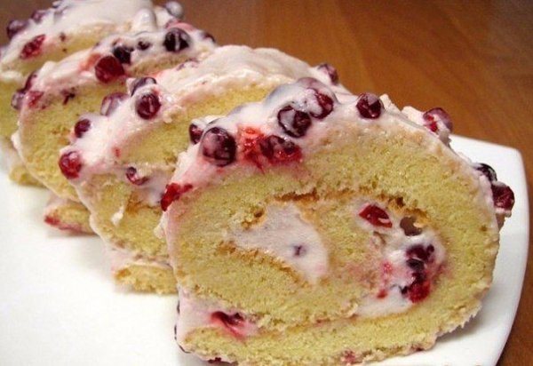 Описание: Бисквитный рулет с брусничным суфлеИнгредиенты:Яйца куриные — 4 шт.Сахар — 250 гВанильный сахар — 8 гМука — 150 гРазрыхлитель — 10 гЖелатин — 10 гСливки — 250 млБрусника — 150 гПриготовление:1. Так как основой этого угощения станет бисквит, то сначала нам нужно его испечь. Для этого в миске взбиваем яйца с сахаром, можно делать все миксером. Потом высыпаем немного ванили и постепенно выкладываем и муку. Далее нужно насадками вымесить простое тесто, оно не должно быть слишком крутое, но и жидкое не нужно. После подготовим противень, его нужно руками промазать маслом и потом застелить пергаментной или пекарской бумагой. Укладываем тесто и разравниваем его так, чтобы у вас получился слой примерно около одного сантиметра. Ставим бисквит запекаться.2. Когда у вас бисквит приготовится, нужно сделать небольшой трюк. Вынимаем бисквит из противня и выкладываем на небольшое полотенце. Потом сворачиваем его сразу рулетом и так оставляем остывать. 3. Далее нам стоит приготовить суфле. Для этого выливаем сливки в миску и начинаем взбивать их с сахаром. После выливаем желатин, который нужно растворить и сделать это можно просто в теплой воде или на плите. После выкладываем в миску бруснику и снова все взбиваем.4. Теперь разворачиваем бисквит и начинаем его промазывать суфле. После разравниваем его, и у вас должно получиться в суфле достаточно ягод. Потом снова рулет сворачиваем, но на этот раз снимаем бумагу. После перед собой выкладываем рулет и смазываем его сверху суфле. Пока оставляем рулет пропитываться, можно его поставить и в холодильник. Рулет нарезаем небольшими пластиками и нужно подавать его тогда, когда он хорошо пропитается.ПРИЯТНОГО ЧАЕПИТИЯ!