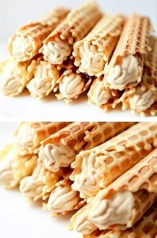 Описание: Хрустящие вафельные трубочкиИнгредиенты:Мука — 125 гКрахмал — 125 гСливочное масло — 125 гЯйцо — 3 шт.Сахар — 175 гВанилинЩепотка солиПриготовление:1. Масло комнатной температуры растереть с сахаром.2. Добавить поочередно яйца, при этом тщательно перемешивать массу.3. Всыпать муку, крахмал, ванилин, соль. Хорошо перемешать.4. Дать тесту подойти в течении 30 минут.5. Выпекать вафли до золотистого цвета.6. Горячие вафли свернуть в трубочки.7. Готовые трубочки наполнить кремом.Приятного аппетита!
