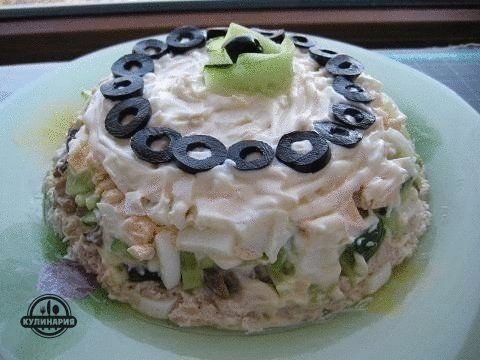 Описание: Ингредиенты:- 1/2 куриного филе- 2 шт. отварных яиц- 1 крупный огурец- 50 г маринованных грибов- 150 г майонезаПриготовление:1. Куриное филе отварить в подсоленной воде, с добавление черного и душистого перца горошком и лаврового листа, затем оставить филе остывать в бульоне (так оно будет более сочным и нежным).2. Яйца, огурцы и грибы мелко порезать. Грудку так же мелко порезать, поперчить, можно добавить немного приправы по вкусу, смешать с небольшим количеством майонеза.3. Выкладываем слоями: куриная грудка, перемешанная с майонезом, грибы, сеточка из майонеза.Огурцы, майонез, яйца, майонез.4. Украсить на ваш вкус, убрать в холодильник на пару часов.Приятного аппетита!