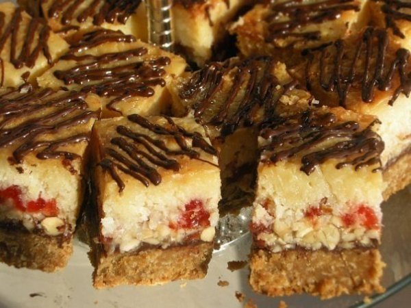 Описание: Домашние пирожные Ингредиенты:Раскрошенное печенье — 300 гРастопленное сливочное масло — 150 гМелко порезанные орехи — 150 гШоколад — 100 гЗасахаренная вишня — 100 гСушёный кокос — 200 гСгущённое молоко — 600 млШоколад — 50 г (для украшения)Приготовление:1. Нагреть духовку до 160 гр.2. Смешать крошки печенья с маслом и прижать ко дну формы, смазанной маслом, со стороной примерно 20 см и не ниже 5 см.3. Посыпать орехами, натёртым шоколадом, вишней и кокосом.4. Полить сгущённым молоком и разровнять сверху.5. Запекать 30-35 минут до золотистого цвета.6. Очень важно, чтобы смесь не оказалась слишком сильно запечённой.7. Дать остыть в форме за ночь.8. Когда всё застынет, острым ножом порезать на квадраты.9. Шоколад положить в пакет и опустить в горячую воду(не кипяток!), отрезать малюсенький кусочек и нанести рисунок на пирожное.ПРИЯТНОГО ЧАЕПИТИЯ!