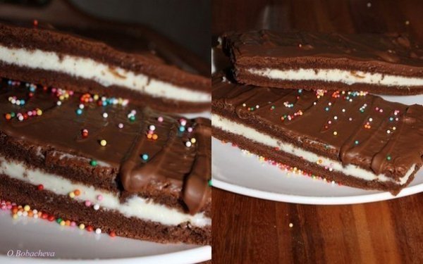 Описание: Пирожные а-ля "Киндер Дэлис"Бисквит:- 4 яйца- 110 г сахара + 10 г ванильного сахара- 30 г просеянной муки- 30 г какао-порошка (НЕ сладкий)Крем:- 160 г сливочного сыра "Маскарпоне"- 60 г молока сгущенного (НЕ вареное)- 100 г шоколада (черный или молочный)Приготовление:1. Духовку разогреть до 210 С. Ванильный сахар смешать с обычным сахаром. 2 яйца и 2 желтка перемешать со 100 г сахара до пышной, белой пены - масса должна увеличиться в 2-3 раза.2. Всыпать просеянную муку и какао, перемешать.3. Оставшиеся 2 белка взбить с щепоткой соли и оставшимся сахаром (20 г) до белой, гладкой пены и аккуратно ввести лопаткой в тесто движениями снизу вверх. Масса не должна опасть.Стандартный противень застелить бумагой для выпечки или силиконовым ковриком. Вылить тесто, разровнять и печь около 10-12 мин. в горячей духовке. Смотрите по вашей духовке, время может отличаться.4. Готовый бисквит снять с противня, убрать бумагу и слегка охладить.5. В это время готовим крем: маскарпоне и сгущенку взбить миксером или венчиком до однородной массы.6. Остывший бисквит разрезать на 2 равные части, подровнять края. Одну смазать кремом, накрыть сверху второй половиной.7. Готовый тортик разрезать на пирожные.Растопить шоколад и смазать верх и бока (по желанию). Убрать в холодильник до застывания шоколада (минут на 20).ПРИЯТНОГО ЧАЕПИТИЯ!