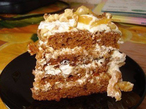 Описание: Торт "Трухлявый пень"Ингредиенты:- 2 яйца- 1 стакан сахара- 1 стакан любого варенья (лучше всего смородина, вишня)- 1 стакан кефира или простокваши- 2 ч.л. соды- 1,5 - 2 стакана мукиПриготовление:1. Яйца взбить с сахаром, добавить варенье, размешанную в кефире соду (когда смешиваешь кефир с содой, все начинает сильно пениться, поэтому надо смешивать в высокой чашке!;), муку. Все перемешать. Тесто негустое, свободно стекает с ложки!; 2. Можно сделать 2 коржа, но я беру противень с высокими бортиками и выпекаю сразу. Выпекать минут 20-25. Каждый корж разрезать на 2 части (всего получается 4 коржа). Коржи можно пропитать сиропом или водичкой, смешанной с вареньем.3. Крем только сметанный!; 0,5 литра сметаны взбить с 0,4 стакана сахара.Украсить на свой вкус.