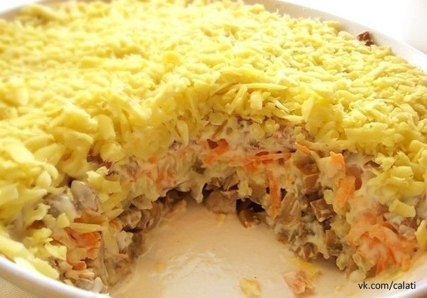 Описание: Салат "Белая ночь"Ингредиенты:200г маринованных грибов2 средние луковицы (обжарить)2 средние картофелины (отварить в "мундире")1 сырая морковь300 г любого вареного мяса (можно язык)250 г твердого сырамайонез и сметана (по вкусу)Приготовление:Грибы мелко нарезать, уложить в салатникЛук нарезать и обжарить на раст. масле, дать остыть и стечь маслу. Уложить на грибыСмазать соусом (сметана майонез)Картофель очистить, натереть на крупной терке. Смазать соусомМорковь натереть на крупной терке, смазатьМясо нарезать маленькими кусочками и уложить на морковь, смазать соусомСверху натереть на крупной терке сыр и полить соусом (я не лила).Можно украсить ломтиками лимона и зеленью.Очень вкусный салатик! Приятного аппетита!