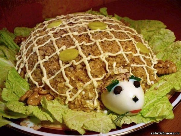 Описание: Потребуется:1 куриная грудка- сварить, порезать кубиками. 150 грамм твёрдого сыра- натереть на тёрке. 2 яблока- порезать мелким кубиком.. 4 яйца -1 оставить на украшение..3 - натереть на тёрке отдельно белки от желтков. 1 луковица- порезать, залить кипятком на 10 мин (чтобы ушла горочь), воду слить.100 грамм чернослива- порезать..150 грамм грецких орехов.. листья салата, петрушка майонез,Приготовление:На плоское блюдо выкладываем подготовленные продукты ( в форме черепахи ) слоями, каждый слой промазываем майонезом: 1 слой- белки 2 слой- курицу, 3 слой - яблоки4 слой - чернослив5 слой - сыр,6 слой - желтки, майонез. Салат обкладываем половинками грецкого ореха, из варённого яйца делаем голову, глазки- перец горошком, из орехов делаем лапки. Украшаем блюдо зелёным салатом и зеленью. Приятного аппетита..