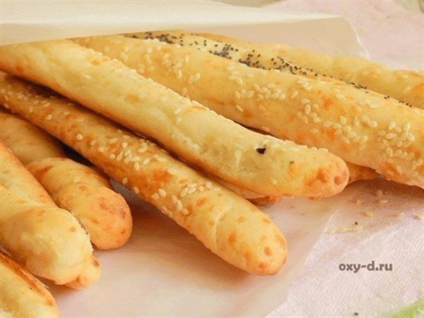 Описание: Хлебные палочки с сыром "Улетные"Ингредиенты:- Мука - 300 г- Дрожжи сухие - 1 ч.л.- вода - 170 мл- сыр твердый - 100 г- мед - 1ч.л.- соль - 1\2 ч.л- оливковое масло - 1 ч.л.- молоко для смазывания- кунжут или мак для обсыпкиПриготовление:1. Дрожжи и мед растворите в теплой воде. Муку просейте вместе с солью в большую миску. К муке добавьте оливковое масло. Затем добавьте воду с дрожжами и медом. 2. Замесите тесто. Оставьте в теплом месте на 1 час,тесто увеличится примерно вдвое. Сыр натрите на мелкой терке. Частями замешивайте в тесто сыр. 3. После того, как добавите в тесто весь сыр, оставьте его в теплом месте еще на 30 минут. А пока нагрейте духовку до 170 градусов. Тесто снова должно увеличится в размере. Отщипывайте от теста одинаковые кусочки и раскатывайте их в колбаску. Ее смажьте молоком и присыпьте кунжутом или маком. 4. Можно сделать попроще. Тесто раскатать в лепешку толщиной 5-7 мм. Смажьте молоком, посыпьте кунжутом. От лепешки отрезайте полоски шириной 1-1,5 см и закручивайте их. 5. Выпекайте на смазанном маслом противне минут 20, пока палочки не зарумянятся.