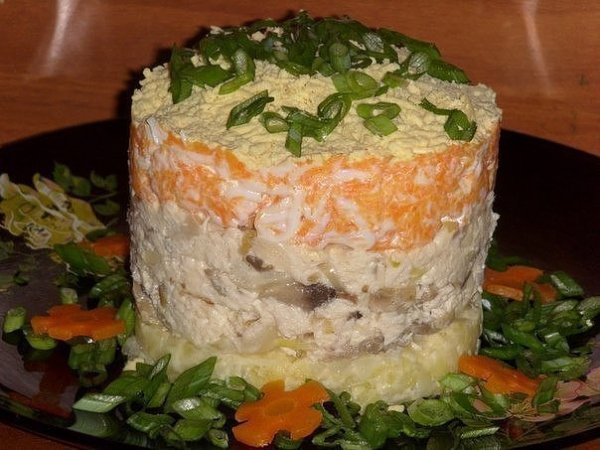 Описание: Салат"Лисья шубка"Картофель-2 штМорковь-1 шт.Грибы-100 гр.Филе-100 гр.Яйцо-1шт.Майонез-3 стол.ложки.Лук репч-2 шт.Укладываем слоями.1.Отварить картофель,натереть+соль,немного майонеза.2.Кур. филе нарезать(заранее отварить)+майонез,соль,перец.3.Грибы обжарить с луком.4.Вар. морковь натереть+белок,майонез.5.Желток,зелень.В этот раз я грибы смешал с курицей. Получилось намного сочнее.Приятного аппетита! :ням
