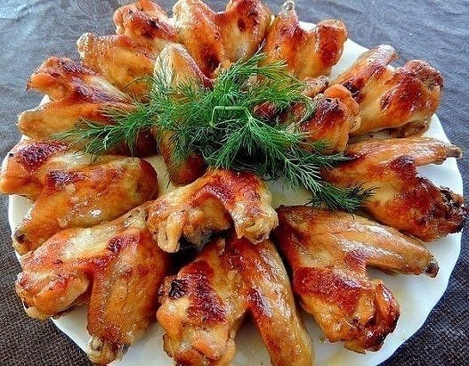 Описание: Куриные крылышки в медово-соевом соусе.1 кг куриных крылышек2 ст. л. меда4 ст. л. соевого соуса2 ст ложки оливкового масла1 ч. л. острого соуса Табаско1 ст. л. хорошего кетчупа или томатной пастысоль, специиКрылышки помыть, просушить и залить соусом.Дать постоять в маринаде не меньше 2-х часов, можно оставить на ночь в холодильнике.Форму для выпечки смазать маслом и выложить маринованные крылышки.Выпекать 30-40 мин при температуре 200 градусов.Приятного аппетита! :ням