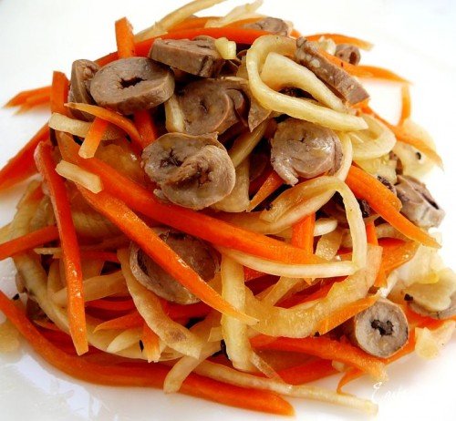 Описание: Аппетитный и невероятно вкусный салат из куриных сердечек с маринованным луком именно тот салат, который действительно стоит попробовать!Этот салат хоть и прост, но праздничный стол разнообразит. А любители салатов с маринованным луком съедят его в первую очередь!Ингредиенты:куриные сердечки 600 г 1 крупная морковь 1 крупная луковица половина лимона соевый соус растительное маслоСпособ приготовления:Куриные сердечки отварить и нарезать колечками (или соломкой).Морковь нашинковать соломкой. Полить соевым соусом.Лук нашинковать полукольцами, полить соком половины лимона.Соединить все ингредиенты, добавить соль и свежемолотый перец по вкусу, заправить растительным маслом. Дать салату настояться в холодильнике.