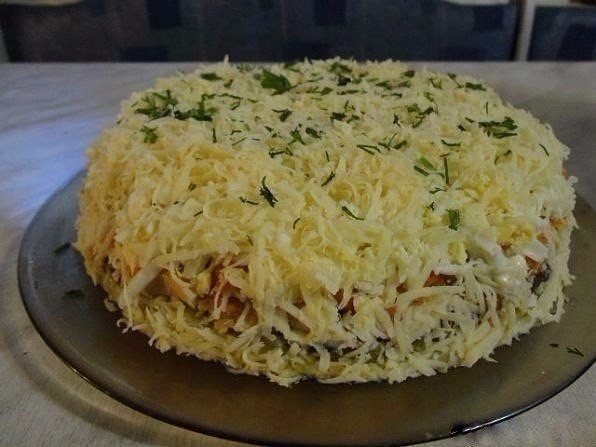 Описание: Салат "Бонопарт"Ингредиенты:500 г шампиньонов свежих500 г куриного филе500 г моркови300 г сыра4 вареных яйца2 шт. картофеля2 шт.лука2 упаковки майонезаПриготовление:1. Грибочки порезать, поджарить на маленьком количестве растительного масла, поперчить и посолить.2. Морковь перетереть на терке, поджарить до готовности, посолить.3. Куриное филе сварить до готовности в подсоленной воде с лавровым листом, поперчив.4. Картофель отварить,5. Сыр, яйца и картофель потереть на терке, лук мелко нарезать и поджарить.6. Салат выкладывается слоями : картофель, потом грибы, майонезная сетка, курица кусочками, лук, морковь, майонез, яйца, сыр, майонезная сетка.7. Перед подачей на стол украсить салат грибами и зеленью или по желанию, охладить, и можно подавать.Приятного аппетита!