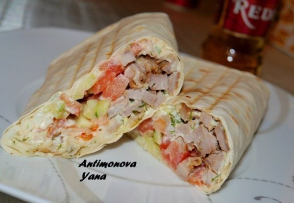 Описание: Шаурма в лавашеИнгредиенты:лаваш тонкий 2 штсвинина(можноиспользовать и курицу)350-400 гркапуста пекинская 100грпомидоры 2 штогурцы 2 штлук репчатый 1 штДля соуса:сметана 3 ст.ложкимайонез 2 ст.ложказубчик чеснока 3 штпучок укропаПриготовление:1. Свинину посолить,обжарить и мелконарезать,поперчить.Помидоры,огурцымелко нарезать,капустунашинковать.Лукнарезать полукольцами.2. Для соуса всеингредиентысмешать,укроп мелкопокрошить,чеснокпропустить через пресси добавить в соус.3. На лаваш намазатьнемногосоуса,выложитьначинку,снова соус изавернуть в рулет(краятоже должны бытьзакрыты).4. Готовую шаурмуможно по желаниюподжарить в гриле,дляобразованияаппетитной корочки.Приятного аппетита!