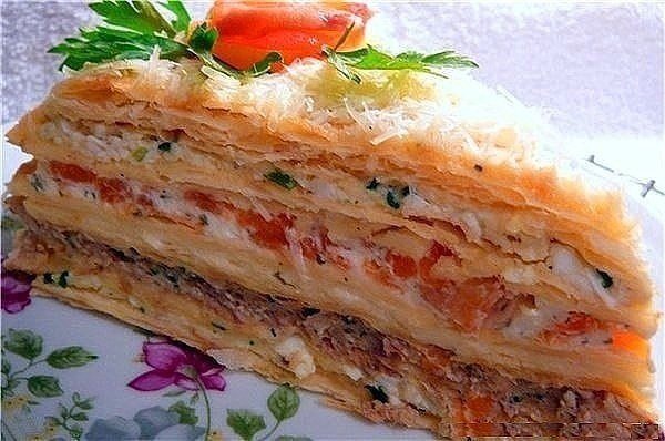 Описание: Рыбный закусочный тортИНГРЕДИЕНТЫ:5 шт. вафельных коржей1 банка рыбных консервов вмасле, по желанию, сгодятся иобычные сардины3 вареных яйца150 гр. твердого сыра1 зубок чеснока майонеззеленый лукПРИГОТОВЛЕНИЕ:По отдельности измельчитьяичные желтки и белки.Натереть на терке сыр.Консервы помять вилкою. Всеначинки смешиваем смайонезом, количество ижирность которого, конечноже, по вкусу и смелости. Подпервый корж можноположить на блюдо еще одинвафельный корж, дабынастоявшийся ипропитавшийся нашзакусочный шедевр, немноговзмокнув, не приставал кблюду и не порвался наглазах у зрителей. Первыйкорж вафельной заготовкипромазываем тертым сыром,который смешан с майонезоми чесноком.Накрываем это вторымкоржом, который мажемслоем рыбы с майонезом.Накрываем третьимвафельным коржом исмазываем белком с зеленымлуком, который тоже смешанс майонезом. Накрываем этоследующим коржом, которыймы смазываем майонезом ипосыпаем измельченнымжелтком и тертым лучком.Если этот тортик покажетсявам немного тонким предлагаю увеличитьколичество продуктов вдвоеи взять 10 вафельных коржей,дважды повторивчередование слоев! Приятногоаппетита