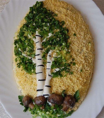 Описание: Салат "Березка".Вам потребуется:куриное филе — 300 гр.,шампиньоны свежие — 300 гр.,яйцо — 5 шт.,огурец маринованный — 5-6 шт.,майонез,лук зеленый — 50 гр.Как готовить:Перед приготовлением салата нужно предварительно подготовить продукты. Шампиньоны с луком обжарить на растительном масле, куриную грудку отвариваем в подсоленной воде. Яйца также сварить. Мелко нарезать огурец.1 слой — выкладываем обжаренные с луком грибы.2 слой — нарезанная кубиками куриная грудка.Перемазываем майонезом.Сверху натираем белок на крупной терке.3 — выкладываем огурцы.Перемазываем.4 — натираем желток на мелкой терке и украшаем.Рисуем майонезом ствол березки.Черные полосочки делаем из нарезанных маслин.Мелко шинкуем зеленый лук.И делаем листву березке.Салат «Березка» готов!Приятного аппетита!