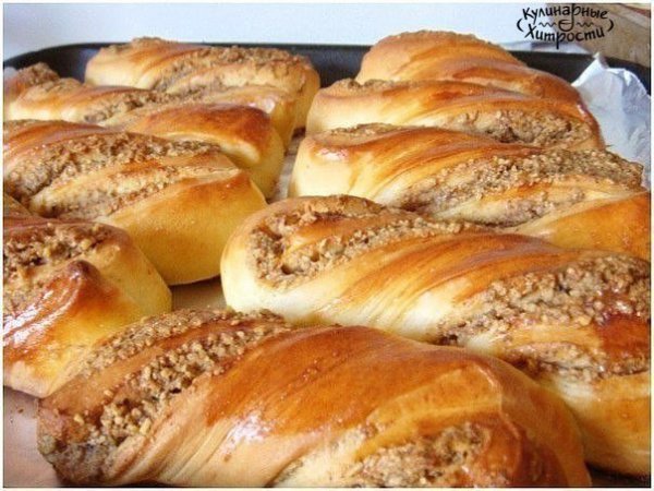 Описание: ОРЕХОВЫЕ БУЛОЧКИИнгредиенты:Для теста: 1 кг обычной муки 130 гр. сахара 2 чайные ложки соли без горки 20 грамм сухих дрожей или 42 гр. свежих дрожжей 500 мл. чуть тёплого молока150 гр. мягкого слив. масла 2 столовых ложки подсолнечного масла без запаха 2 яйца ваниль Для ореховой начинки: 50 гр. слив. масла, 200 гр молотых орехов (любых и изюма по желанию) - у меня только жаренные грецкие орехи 80 гр. сахара (или по вкусу) немного молока (только, чтобы немного разжижить начинку) 1 чайная ложка корицы (или по вкусу)Приготовление:Тесто:В большую чашку просеять муку. Дрожжи развести в теплом молоке, добавить сахар и ваниль, перемешать. Добавить яйца и хорошо взбить венчиком. Вылить эту жидкость к муке, насыпать соль и добавить мягкое масло, замесить мягкое, эластичное тесто, накрыть и поставить его в тёплое место пока его объём не увеличится в 2 раза, это может занять 2 часа (я писала выше, что тесто делаю вечером и ставлю на ночь в холодильник). Начинки:Для ореховой: Расстопить масло, добавить сахар, прокрученные жаренные орехи и мешая, добавить столько молока чтобы получилась густая каша. Тесто раскатать прямоугольником, положить на неё ореховую начинку, разровнять и загнуть сначала один конец к середине, а потом загнуть другой. Разрезать тесто на полоски, закрутить их и положить на противень застеленный бумагой для выпечки, смазать желтком и поставить в тёплое место на минут 20. Выпекать 20-25 минут в предварительно нагретой до 200C духовке.