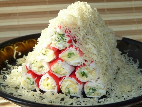 Описание: ЗАКУСКА "МОНАСТЫРСКАЯ ИЗБА"ИНГРЕДИЕНТЫ: Крабовые палочки 10 шт 2 яйца 100 гр. сыра 2 зубчика чеснока Зелень Майонез 1ст.лПРИГОТОВЛЕНИЕ:Яйца сварить, охладить, почистить и натереть на крупной тёрке. Сыр натереть на мелкой тёрке. Чеснок пропустить через пресс. Зелень намыть, обсушить и мелко порезать. Соединить яйца, сыр, зелень и чеснок. Добавить майонез и хорошо перемешать. Завернуть нашу начинку в крабовые палочки, выложить горкой и посыпать тёртым сыром.