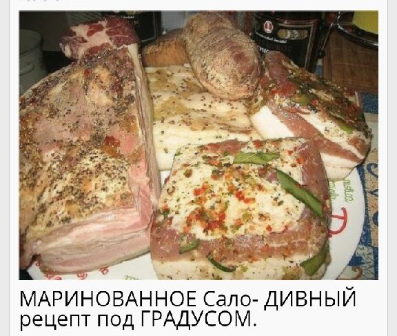 Описание: МАРИНОВАННОЕ Сало- ДИВНЫЙ рецепт под ГРАДУСОМ. Сказать, что Вкусно – значит, ничего не сказать! Мягкое, нежное и чуточку влажное сало... Вы о таком давно мечтали! Попробуйте, засолите еще и по такому способу - не ПОЖЕЛЕЕТЕ Для маринования лучше подбирать мягкое, свежее сало с прожилками мяса и выбирать кусочек потолще. Чтобы узнать, не волокнистое ли сало, есть простой способ. Проткните сало спичкой. Если она легко входит в мякоть, значит, сало мягкое. Именно такое и нужно для маринования. Сало разрезается на кусочки , примерно 5х5 см. Очищенные дольки чеснока режутся пластинками, обваливаются в смеси из соли и черного молотого перца и этим шпигуется каждый кусочек сала. Приготовим рассол, в котором будет мариноваться сало. На литр воды понадобится 200 грамм соли (не йодированной!). Воду нужно закипятить, добавить соль, лавровый лист, черный перец горошек. Для цвета можно положить в рассол шелуху от лука, тогда сало будет с легким коричневым оттенком. В кипящий рассол закладываем нарезанное сало, ждем, пока закипит, уменьшаем огонь и даем прокипеть минут 5-10. Время зависит от величины кусочков, чем они больше, тем дольше нужно кипятить сало. Шумовкой достаем кусочки и сразу же, горячими, складываем в банку. Банка заполняется до верха. и Потом заливается ОХЛАЖДЕННЫМ рассолом В КОТОРЫЙ Предварительно ДОБАВЛЯЕМ 100 грамм ВОДКИ . Это рассол в котором в варилось сало. Закрывается крышкой. Будет готово недели через две – салу нужно время, чтобы пропитаться рассолом и впитать аромат пряностей. Такое сало можно хранить под полиэтиленовой крышкой или закатать.