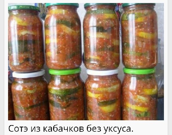 Описание: Сотэ из кабачков без уксуса.Ингредиенты : 6 кг кабачков,3,5 — 4 кг красных помидор,1 кг лука,растительное масло для жарки кабачков и лука,зелень петрушки, укропа1 стакан очищенного чеснока,1 стакан сахара, соль по вкусу (~ 2 ст. л. соли).Приготовление :Кабачки порезать кружочками 1,5 — 2см, посолить, дать постоять минут 20.Обжарить кабачки до золотистого цвета.Лук обжарить до янтарного цвета отдельно. Помидоры прокрутить на мясорубке, добавить жареный лук, дать закипеть и варить на медленом огне минут 35 — 40. Добавить сахар, соль по вкусу. За 5 минут до окончания варки добавить нарезанную зелень петрушки, укропа и чеснок выжатый на прессе. В стерилизованные банки начинаем укладку кабачков. Сначала на дно банки вливаем немного подливки из помидор, затем слой кабачков, затем снова подливка и т. д до верха банки. Последний слой должна быть подливка по самый край горлышка банки. Накрыть крышкой стерилизованной не закручивая и ставим стерилизовать на 25 мин. Затем закручиваем, переворачиваем вверх дном и укутываем.