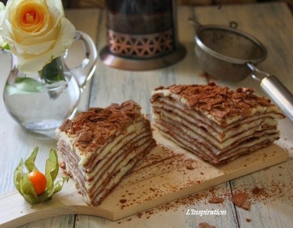 Описание: Шоколадный НаполеонВам потребуется: Тесто:280 г муки130 г масла90 мл молока4 ст.л. какао1/2 ст.л. водкикрупная щепотка соли Крем:2 яйца70 г сахара ст.л. крахмала300 мл молока1 ч.л. ванильного экстракта150 г сливочного масла130 г сгущенного молокаКак готовить: 1. Тесто. Растираем масло с просеянными мукой, какао и солью в крошку. Добавляем молоко, начинаем вымешивать, добавляем водку и замешиваем тесто. С солью получается очень вкусное тесто, и такой контраст:) 2. Долго не вымешиваем, как только соберется в шар, заворачиваем в пленку и убираем в холодильник на 1 час. Тесто можно сделать в комбайне с насадкой для теста. 3. Пока тесто охлаждается, займемся кремом. Достаем из холодильника сливочное масло и сгущенное молоко, они должны быть комнатной температуры. 4. Варим заварной крем. Молоко ставим нагреваться. Яйца слегка взбиваем с сахаром и крахмалом, чтобы не было комочков. Как только молоко нагреется, вливаем тонкой струйкой в яичную смесь, постоянно мешая. 5. Переливаем обратно в кастрюлю и варим на небольшом огне до загустения. Не забываем постоянно мешать, желательно венчиком или деревянной лопаткой. Добавляем ванильный экстракт и варим примерно 7-10 минут. 6. Переливаем в широкую емкость и накрываем пищевой пленкой контактно, то есть прямо по крему, чтобы не образовалась корочка. Оставляем остужать. 7. Займемся коржами. Тесто делим на 8 частей. Каждый кусочек раскатываем тонко (можно между двумя листами пергамента), накалываем вилкой, вырезаем по нужному диаметру (у меня прямоугольная форма 14*30 см) и вместе с обрезками ставим в разогретую до 180 градусов духовку на 5-7 минут. Остальные будут выпекаться быстрее. Готовые коржики складываем стопочкой. Обрезки складываем отдельно. 8. Как будут выпечены все коржи, займемся кремом. Сливочное масло взбиваем. Вводим заварной крем по 1 ч.л. и постоянно взбиваем, я сначала это делаю вручную венчиком. Заварной и масло должны быть одной температуры, чтобы крем не расслоился. 9. Как только введем весь заварной, начинаем вводить сгущенное молоко. Если Вы боитесь, что у вас расслоится крем, то можно сделать так: в заварной крем по чуть-чуть ввести сливочное масло и пробить блендером, охладить до загустения и ввести сгущенное молоко. 10. Промазываем каждый корж обильно кремом. Сверху торт обмазываем кремом и посыпаем измельченными обрезками. Ночь в холодильнике обязательна!