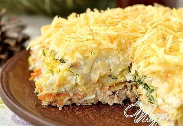 Описание: ЗАКУСОЧНЫЙ ТОРТ ИНГРЕДИЕНТЫ:● консервированная скумбрия - 1 банка (можно брать сайру или сардину),● морковь - 1 шт.,● яйцо - 3 шт.,● грецкий орех-50 гр.,● сыр твердый-70 гр.,● майонез или йогурт - 200 гр.,● зелень укропа - 1 пучок,● сольПРИГОТОВЛЕНИЕ:Подготовим все ингредиенты для укладки слоями на торт. Яйца нужно сварить и остудить. Морковь очистить, натереть на терке. Ядра грецкого ореха нарубить и добавить к моркови, посолить, полить майонезом и перемешать.На блюдо, на котором будет подаваться торт, положить вафельный лист. Блюдо взять размером чуть больше размера листа, чтоб салат не получился проваленным внутрь. Из майонеза сделать сеточку и выложить скумбрию, размятую предварительно вилкой. Это будет первый слой торта.Накрыть следующим коржом из вафли. Вторым слоем - выложить морковь с грецким орехом. Третий слой также как и первый смазываем майонезом, натрем яйцо и уложим равномерно на корж. Зелень промыть, мелко нарубить и выложить на яйцо, немного посолить.Четвертым завершающим слоем будет слой из вафельного коржа с майонезом и тертым сыром, сыр будет служить еще и украшением торта. Закусочный торт из вафельных коржей с консервами готов. Майонез в этом рецепте блюда можно заменить йогуртом без добавок смешав его с горчицей или приготовив свой домашний майонез. Так же в морковь с грецким орехом можно добавить дольку чеснока. Для любителей поострее, добавится пикантность во вкусе всего торта.После приготовления отправьте закусочный торт в холодильник на 2 часа, подавать его рекомендуем небольшими кусочками, т.к. блюдо это калорийное и сытное. Совет: не переусердствуйте в смазывании коржей майонезом, вам может показаться, что майонеза мало, а после пропитки вы поймете, что он излишне пропитан майонезом.