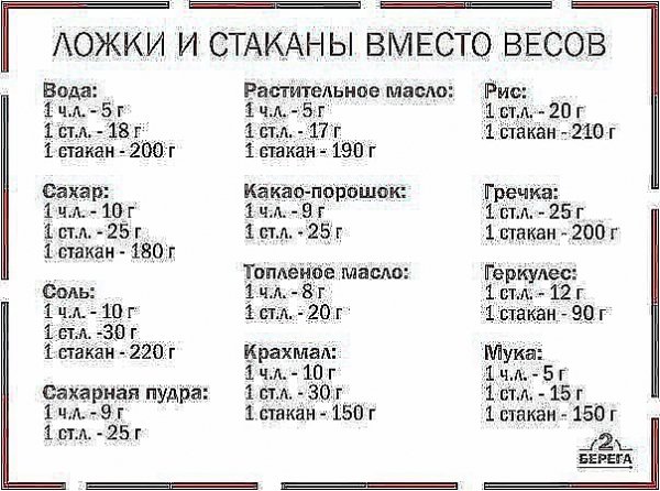 Описание: 1 стакан = 240 мл3/4 стакана = 180 мл2/3 стакана = 160 мл1/2 стакана = 120 мл1/3 стакана = 80 мл1/4 стакана = 60 мл1 ст.л. = 15 мл1 ч.л. = 5 мл1 ст.л. = 3 ч.л.1 стакан = 16 ст.л.1 литр = 4 стакана + 2 ст.л.Соотношение-вес/объём различных продуктов.Масло1 стакан растительного масла = 200 г1 стакан сливочного масла = 240 г1 с.л. сл.масла = 15 гМука, какао, крахмал1 стакан муки = 140 г1 ст.л. = 10 г1 ч.л. = 3 г1 стакан цельнозерновой муки = 125 гСахар белый1 стакан = 200 г1 ст.л. = 12 г1 ч.л. = 4 гСахарная пудра1 стакан = 120 г1 ст.л. = 8 г1 ч.л. = приб. 3 гЯйцаБольшое яйцо = 65 г и большеСреднее яйцо = 60 гМаленькое яйцо = 50 гРазное1 стакан миндаля/орехов измельч. в муку = 85 г1 стакан орехов/миндаля измельчённых в крошку = 100 г1 ст.л. орехов/миндаля - крошка = 6 г1 стакан овсянки = 100 г1 стакан удлинённого риса = 200 г1 стакан круглого риса = 210 г1 ст.л. сухих дрожжей = 10 г1 стакан соли = 200 г1 ст.л. соли = 20 гЖелатин1 упаковка = 14 г1 ст.л. = 10 г1 лист желатина = 4 гРазрыхлитель, сода1 упаковка = 10 г (прибл. 1 ст.л.)1 ст.л. без верха = 8-9 г1 ч.л. = 3 г