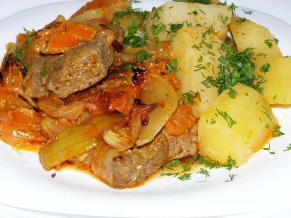 Описание: ЖАРКОЕ ПО-ДОМАШНЕМУ Ингредиенты: ● 500 гр - мясо ● 1 шт - лук репчатый ● 1 шт - морковь ● 1 шт - перец болгарский ● 2 шт - помидоры ● картофель Приготовление: Мясо порезать кусочками и обжарить до полу готовности. Добавить нарезанный лук репчатый и пожарить вместе с мясом. Перец и морковь нарезать соломкой и добавить к мясу. Всё обжарить пока морковь не станет мягкой.Добавить 1-2 столовой ложки муки и перемешать.На мясо выложить нарезанный кубиками картофель, залить водой почти всю картошку, посолить, поперчить.Тушить под крышкой до готовности картофеля.Помидоры нарезать кубиками и добавить в жаркое. Добавить лавровый лист и тушить ещё 10 минут. Когда жаркое будет готово, лавровый лист убрать. При подаче посыпать зеленью.