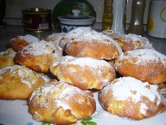 Описание: Яблочные булочки Ингредиенты: - 120 г сахара - 4 яйца - 200 г растопленного маргарина - 1 пакетик ванилина - 1 пакетик разрыхлителя - 500 г муки - 4 яблока, порезать мелкими кубиками Приготовление: Смешать все ингредиенты и добавить яблоки. Готовое тесто выложить столовой ложкой на застеленный пергаментом противень. Близко не кладите, так как при выпекании изделия будут увеличиваться в объеме. Выпекать при температуре 200 градусов 10-15 минут. Приятного аппетита!