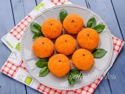 Описание: Такие «Чесночные мандарины» произведут настоящий фурор на вашем праздничном столе – закуска выглядит очень оригинально, готовится просто и быстро, а получается вкусной.Любите мандарины и все, что с ними связано? Не имеете ничего против сыра с чесноком? Тогда приготовьте такую замечательную закуску на свой праздничный стол. Да – именно на одной из самых популярных закусочных вариаций «сыр + чеснок» основан рецепт таких «Чесночных мандаринов».На приготовление этой закуски уйдут считанные минуты, зато эффект от нее будет весьма впечатляющим!РЕЦЕПТ ЗАКУСКИ «ЧЕСНОЧНЫЕ МАНДАРИНЫ»200 г твердого сыра3-4 зубчика чеснока3 соломки соленых/полосочки копченого сыра1 морковьмайонезоливки без косточкипетрушкаКак приготовить закуску из сыра с чесноком в виде мандаринов:Потереть сырую очищенную морковь на мелкой терке, отжать сок.Сыр потереть на мелкой терке.Чеснок очистить и пропустить через пресс.Соединить морковь с сыром и чесноком, заправить майонезом – масса должна получиться такой, чтобы держала форму.Скатывать из массы небольшие шарики, в центр каждого выкладывая по оливке.Выложить «мандарины» на блюдо, воткнуть в верхушку кусочек копченого сыра или соленой соломки, сделать веточку из петрушки.Приятного застолья!Чтобы шарики были еще больше похожи на мандарины, можно дополнительно обвалять их после формования в мелко натертой моркови.