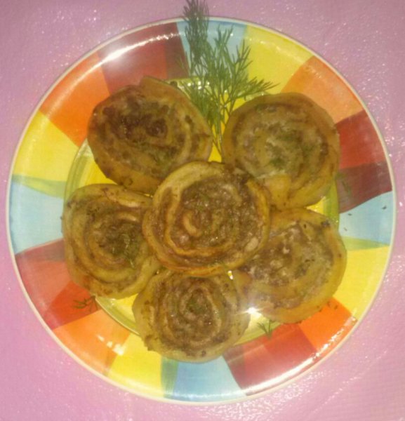 Описание: Ленивые шанежки.Тесто картофельное(пюре,яйцо,соль,молотый перец,укроп,разрыхлитель,мука).Начинка свино-говяжий фарш(лук,соль,молотый перец,сухие травки-приправки)..Жарила на небольшом огне под крышкой с добавлением небольшого к-ва раст.масла.