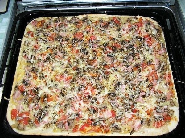 Описание: Как приготовить пиццу с тонкой хрустящей основой за 20 минут.На приготовление этой пиццы у меня ушло 20 минут! Для начала зажжем духовку ...Тесто:- 2 ложки сметаны,- 100-150 г кефира,- 50 г масла или маргарина (растопить),- Соль - треть ч.л.,- 0,5 ч.л соды,- мука,- щепотка сахара.Приготовление:Смешать кефир и сметану вилкой, добавить соль и соду-через 1-2 минуты пойдет пена. Добавить сахар и маргарин. Добавив муку, замесить очень мягкое (возможно даже немного липнущее к рукам тесто)Тут же положить его на смазанный противень и разровнять руками ( пласт не толстый), уложить начинку (у меня послойно лук, копченая колбаса, сыр, майонез). Майонез обязательно последним слоем (тонкая сеточка из пакетика). Мне очень нравятся Прованские травы-посыпаю щепотку.Пеку при 180 гр. до подрумянивания теста.P.S по просьбам читателей пишу точное кол-во муки для моей пиццы (приготовила во второй раз) - на половину 250г стакана кефира (остальное по рецепту) у меня ушло 1,5 такого же стакана муки (1 стакан вмешан в тесто, половина высыпана на стол и в ней замешано окончательно)