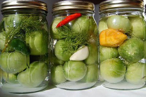 Описание: Зеленые (бурые) помидоры Пальчики оближешьНа 3 кг. помидоров200 гр. зелени: петрушка, укроп, листья вишни (или смородины)100 гр. репчатого лука (я в каждую банку нарезала по пол луковицы)1 головка чеснокаЗаливка:3 литра воды9 ст. ложек сахара2 ст. ложки соли2-3 штуки лаврового листа5 горошин перца душистого1 стакан 9% уксусаРастительное масло (берется из расчета 1 ст. ложка на литровую банку)Такие же помидоры можно готовить с другойзаливкой (на 3-х литровую банку):1,5 литра воды1 ст. ложка сахара1 ст. ложка соли1 столовая ложка уксуса1 ст. ложка растительного маслаВ банку сначала выкладываете зелень, чеснок, растительное масло. Затем помидоры (большие порезать), а сверху лук. В готовую заливку добавляете уксус и заливаете горячим маринадом помидоры. Стерилизуете 15 минут.