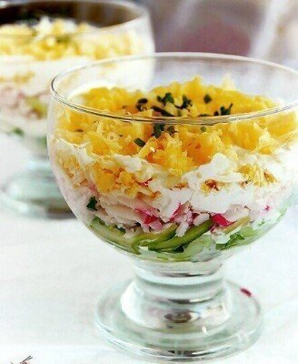 Описание: Салат "Вкусный"Для салата понадобится:свежий огурецяйца варёныесыркрабовые палочкилук репчатыймайонезСалат выкладывается слоями:1 слой-лук,порезанный мелко,смазать майонезом;2 слой-огурец на крупной тёрке(лишнюю жидкость отжать),смазать майонезом;3 слой-крабовые палочки натереть на тёрке,смазать майонезом;4 слой-яйцо натереть на тёрке,смазать майонезомСлои повторить.Верхний слой -сыр на тёрке.Салат готов!Можно его немного украсить зеленью.