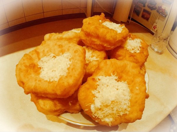 Описание: Лангоши. Замечательные венгерские лепешки3-4 средних картошки1/2 пакетика сухих дрожжей1/2 чашки теплого молока (развести дрожжи) 1/2 ч.л. сахара1 1/2 -1 2/3 чашки муки1/2 чл солижир для жаркиСварить картошку в подсоленной соленой воде. Сразу слить и размять, должно быть где-то 1,5 чашки. Охладить.Смешать теплое молоко, дрожжи и сахар. Дать постоять 5-10 мин.Смешать картофельное пюре с мукой и солью. Муку добавлять постепенно, начиная с 1.5 чашки и добавлять до получения однородного теста. Вымесить хорошо. Положить в миску, накрыть, дать подойти в теплом месте, до увеличения в объеме в два раза, примерно 1 час.Раскатать тесто в пласт толщиной 1/2 инча (1.7-1.8 см). Порезать на прямоугольники, квадраты или кружки. Проткнуть,ножом, для предотвращения пузырения теста.Расплавить жир, должно быть где-то половины объема. (как я понимаю обжаривать во фритюре) Жарить на огне выше среднего. Если температура жира будет слишком большой, то лангош будет гореть, если слишком низкая - возьмет очень много жира, будут жирными. Жарить до образования "хорошего" (золотистого) цвета. Готовые лангошечки натереть чесноком и посыпать солью и паприкой (перцем)Подавать теплыми. Хороши с супом, вином и пивом. И просто так очень вкусно.