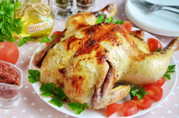 Описание: Рецепт не классический, а скорее такой грузинский фьюжн. Курочка в ароматных травах, маринованная в мацони с чесноком и имбирем. Невероятно вкусно, рекомендую попробовать!ИНГРЕДИЕНТЫЦыпленок1 ШтукаМацони 200 ГраммКорень имбиря 1 Штукакусочек 1*1 смЧеснок 2 ЗубчикаУцхо-сунели 0.5 Чайных ложкиШафран имеретинский 0,5 Чайных ложкиКориандр молотый 0,5 Чайных ложкиСванская соль 0,5 Чайных ложкиСливочное масло 120 Граммдля пряного маслаЧеснок 2 Зубчикадля пряного маслаЗира молотая 0,25 Чайных ложкидля пряного маслаКорица молотая 0,25 Чайных ложкидля пряного маслаКуркума 0,25 Чайных ложкидля пряного маслаКориандр молотый 0,25 Чайных ложкидля пряного маслаУцхо-сунели 1 Щепоткадля пряного маслаИмбирь молотый 1 Щепоткадля пряного маслаПерец кайенский молотый 1 Щепоткадля пряного маслаСванская соль 1 Щепоткадля пряного маслаШаг 11. Приготовьте маринад для цыпленка: натрите имбирь на мелкой терке, порубите мелко чеснок, соедините с мацони, добавьте уцхо-сунели, шафран, кориандр, соль. Перемешайте.Шаг 22. По всей тушке сделайте глубокие небольшие надрезы, натрите со всех сторон маринадом и оставьте на 30 минут.Шаг 33. Приготовьте пряное масло: размягченное сливочное масло соедините с рубленным мелко чесноком, солью, корицей, кориандром, уцхо-сунели, зирой, имбирем и перцем. Перемешайте хорошо.Шаг 44. Замаринованного цыпленка обсушите бумажными полотенцами. Натрите щедро ароматным маслом внутри под кожей через небольшие надрезы, также хорошо смажьте сверху.Шаг 55. Небольшой глубокий противень застелите фольгой, оставьте часть фольги свисать. Положите цыпленка.Шаг 66. Прикройте его концом фольги и отправьте в горячую духовку (180 градусов) на 40 минут. Потом откройте фольгу и пеките еще 20-30 минут, пока курочка не приобретет красивый золотистый цвет и корочку.Шаг 77. Цыпленок по-грузински готов! Очень ароматный, подавайте горячим!Шаг 88. Приятного аппетита!