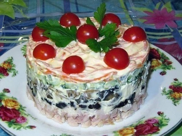 Описание: САЛАТ ВКУСНЯТИНА ГОТОВЛЮ НА КАЖДЫЙ ПРАЗДНИКОбъедение! Ингредиенты: шампиньоны свежие 200 граммкопченное куриное мясо 150 граммкорейская морковь 80 граммчернослив 80 граммсвежие огурцы 150 грамммайонез 150 млрастительное маслоперец, соль, зелень.Приготовление:Выкладываем салат слоями в специальной форме. Ставим форму на плоское блюдо, ставим на него форму, которую смазываем растительным маслом, чтобы можно было легче снять.Выкладываем на дно формы первый слой нарезанное кусочками куриное мясо, промазываем майонезом. Второй слой измельченный чернослив, смазываем майонезом. И так выкладываем все слои по очереди предварительно нарезанные и поджаренные шампиньоны, далее нарезанные мелкими кубиками свежие огурцы и верхним слоем выкладываем корейскую морковь. Промазываем все слои промазываем майонезом. Затем удаляем, аккуратно формочку. Украшаем готовый салат по вкусу, ставим в холодильник на полчаса, чтобы он пропитался и охладился.Приятного аппетита!