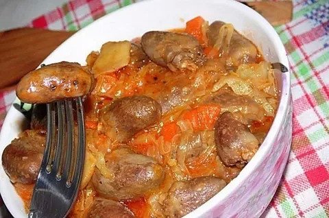 Описание: Куриные сердечки тушенные с капустой и грибамиИнгредиенты :Куриные сердечки - 700 гр Грибы - 300 гр ( у меня шампиньоны заморозка ) Капуста белокочанная - 300 гр Репчатый лук - 1 шт Морковь - 1 шт Томатная паста - 1 стол ложка Растительное масло - для жарки Соль и специи - по вкусу ПРИГОТОВЛЕНИЕ :Репчатый лук мелко нарезать и обжарить до золотистого цвета ,добавить куриные сердечки и морковь нарезанную маленькими кубиками ,всё вместе обжарить и добавить грибы , нашинкованную капусту , томатную пасту ,соль и специи (воду я не добавляла тушилось в собственном соку ) Тушить под крышкой на маленьком огне минут 40 и более Быстро ,просто и очень вкусно Приятного аппетита!