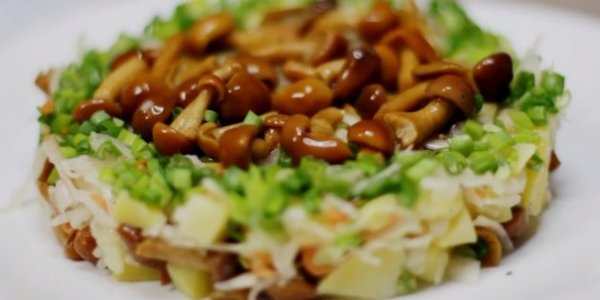 Описание: Лёгкий салат из картошки, квашеной капусты и маринованных грибов. Ингредиенты: 34 картофелины, 200 г квашеной капусты, 150 г маринованных опят, несколько перьев зелёного лука, соль по вкусу, молотый чёрный перец по вкусу, 2 столовые ложки растительного масла. Приготовление. Отварите картофель до готовности, остудите и очистите. Нарежьте его небольшими кубиками. Добавьте капусту, грибы, рубленый лук, соль, перец, масло и перемешайте