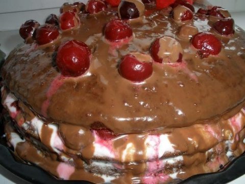 Описание: Вишнёво-шоколадный торт.Вишнево-шоколадный тортИнгредиенты:Коржи:2 яйца1,5ст. сахара2 ст. муки1 ст. молока1/2 ст. растительного масла4 ст.л. какао1,5 ч.л. разрыхлителя1,5 ч.л. содыКрем и прослойка:400 гр сметаны 15% жирности400 гр сметаны 15% жирности150 гр сахара600 гр замороженной вишни Хортекс (разморозить и отжать)Глазурь: 100 гр молочного шоколада и 100 гр сливокПриготовить бисквит:1) Смешать муку, сахар, разрыхлитель, соду, какао.2) Венчиком смешать яйца, добавить молоко и растительное масло.3) Смешать сухую и яичную смеси, если жидко на вид, можно добавит пару ложек муки.4) Влить стакан крутого кипятка и перемешать.5) Перелить в форму и поставить выпекаться в разогретую духовку до 220 градусов на 5 минут. Затем температуру уменьшить до 180 градусов и выпекать еще 35-40.Проверять зубочисткой.1) Приготовить крем, смешав, сметану и сахар. Сахар должен полностью растворится.2)Собрать торт, промазав как следует каждый слой кремом, проложить внутри все вишнями...их положить от души...не жалея, оставив немного ягод для украшения.3)Приготовить глазурь: В сливки разломать шоколад, растопить в микроволновке минуты 3-4. Остудить и дать немного загустеть. После этого обильно полить ею торт и украсить вишнями!Отличный рецепт для сладкого чаепития! Сохраняйте рецептик!