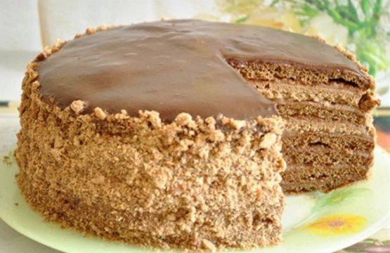 Описание: Шоколадный медовик "Дамский каприз" Татьяна Сальникова Крем 2 стакана молока 2 шт. яйца 0.5-1 стакан сахара 1 пакетик ванильного сахара 2 ст. ложки муки 1-2 ст. ложки какао 100 г. сливочного масла 200 г. грецких орехов Тесто 3 шт. яйца 0.5 стакана сахара 3 ст. ложки меда 2 ч. ложки соды (без горки) 60 г. сливочного масла 3 ст. ложки какао 2-2.5 стакана муки (у меня 2,5 и вконце смазать руки раст.маслом ) Глазурь 2 ст. ложки молока 2 ст. ложки какао 3 ст. ложки сахара 30 г. сливочного масла 1 ст. ложка сметаны Сначала нужно сварить заварной крем. Смешать венчиком в кастрюльке до однородной массы сахар, муку, молоко, ванильный сахар и яйца, помешивая варить до загустения на маленьком огне не давая закипеть, затем снять с огня и добавить какао, хорошо размешать венчиком. Поставить крем остывать (можно поставить его в миску с холодной водой). Теперь тесто и коржи. В кастрюльке хорошо смешать венчиком сахар, мед, яйца, соду и масло, поставить все на водяную баню, хорошо помешивая варить минут 5, пока масса не станет однородной. Снять с бани, добавить какао и хорошо перемешать, порциями всыпать просеянную муку, мешать сначала ложкой пока масса не станет тягучей, затем переложить на стол и подсыпая мукой замесить тесто, оно должно быть мягкое, поделить его на 8 частей. Духовку нагреть на 180 градусов, противень застелить пергаментом, чуть присыпать мукой. Раскатывать тонкие коржи, обрезать по тарелочке размером 19.5-20 см., из обрезков раскатать еще один корж, он пойдет на крошку. Коржи выпекать по 3-5 минуты, пекутся они быстро. Остужать на решетке. В крем добавить размягченное сливочное масло и хорошо взбить. Орехи мелко порубить. Коржи щедро промазывать кремом и посыпать орехами, на каждый корж по 2-2.5 ст. ложки крема, верхний корж не промазывать, оставить немного крема для боков. Смешать в кастрюльке все компоненты для глазури, варить помешивая на маленьком огне минуты 2 до загустения. Нанести горячую глазурь на верх торта (удобнее нанести глазурь на середину, а потом уже распределить к краям), убрать торт в холодильник минут на 5, чтобы глазурь застыла. Корж для крошки измельчить, бока торта хорошо обмазать кремом и присыпать крошкой. Дать пропитаться торту при комнатной температуре часа 3-4 (можно прикрыть его большой миской), затем убрать в холодильник чтобы тортик застыл и охладился. Приятного чаепития!