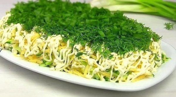 Описание: Удиви гостей - приготовь новый оригинальный салат.Селедка под новой шубойсельдь 1 шт. (филе)лук зеленый большой пучокукроп большой пучокогурец свежий 1 шт.сыр твердый 150 гкартофель отварной 2 -3 шт.майонез 300 гФиле селедки, без костей естественно, нарезаем небольшими кусочками и выкладываем первым слоем на тарелку. . Сверху делаем сетку из майонеза. Удобно это делать из одноразового кулинарного мешка. Далее нарезаем большой пучок зеленого лука и выкладываем на селёдку.Сверху майонез. Отварной картофель натрем на терке и выкладываем третьим слоем.Делаем сетку из майонеза.Далее свежий огурец ,1 небольшой или половинка. Нарезаем соломкой и выкладываем. Сыр натрем на крупной терке и выкладываем.Майонез. Укроп меленько нарежем и очень обильно посыпаем наш салат.Ещё немного добавим зеленого лука и вот такой свежий салат Селёдка под Шубой с сыром без свеклы получается.