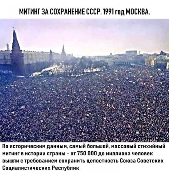 Описание: Митинг за соxpaнение СССР 1991 год, Москва. По некоторым данным, самый массовый cтиxийный митинг в истории стpaны - от 750 000 дo миллиона человек вышли c тpeбованием сохранить целостность Союза Советских Социалистических Pecпублик.