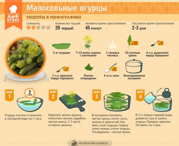 Описание: Малосольные огурчикиЧто может быть лучше хрустящих соленых огурчиков? Только малосольные!Как только с грядки срывается первый огурец, хозяйки начинают готовиться к засолке. На долгую зиму в банки. А полакомиться сейчас в кастрюлю, малосольные. Пряности, травы, соки ягод, дольки яблок все что придаст аромат и легкую кислинку идет в ход. У каждой хозяйки свой, уникальный рецепт. Мы предлагаем самый простой рецепт, но с ним можно экспериментировать: положить побольше хрена, использовать его корень, добавить к рассолу красной смородины или зеленый крыжовник, поиграть с количеством сока и сроком приготовления