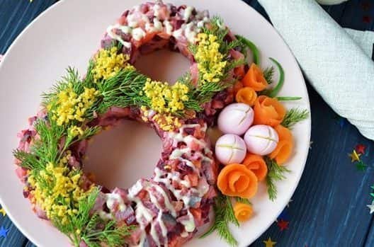 Описание: САЛАТ "8 МАРТА"Ингредиенты:Слабосоленая селёдка 1 шт.,Свекла (средних размеров), - 1 шт.Морковка (средненькая), - 1 шт.Картофель - 1 шт.,Майонез Провансаль ,Соль и перец - по вкусу.Для украшения:яйца перепелиные 3 шт.,3 веточки - укропа,1 шт. - варенное куриное яйцо, вернее его желток,1 шт.- сваренная морковка,сок свеклы 2 ст. л.Приготовление:1.Сначала варим овощи, остужаем их и чистим. Филе рыбы освобождаем от костей и кожи.2.В отдельную ёмкость нарезаем кубиками морковку и картошку.3.Затем очередь за селедкой и луком. Шинкуем и приобщаем к овощам.4.Свеклу режем на кубике и к нашему салату. Солим и перчим. Перемешиваем.4.Возьмите большое, но не глубокое блюдо (лучше плоское). На дно ставим 2 кружки разных диаметров. В виде восьмёрки выкладываем салат.5.Для украшения отварите яйцо и возьмите от него желток (белок не нужен). Желток крошим в виде цветочков мимозы. Сверху веточки укропа.6.Отвариваем морковку и перепелиные яйца. Делаем из них цветы. Яички очищаем от скорлупы и надрезаем сверху крест на крест, придавливаем с боков, чтобы как бы лепесточки раскрылись. Украшаем.7.Теперь убираем аккуратно кружки (кружки лучше использовать без ручек или стаканы).8.Салат на 8 марта в виде восьмерки готов!С наступающим Вас праздником!