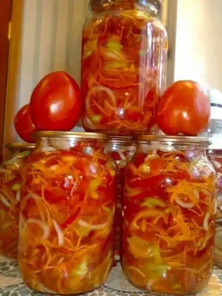 Описание: Вкуснейший салат на зиму "Берегись водка"Многие возможно знают этот замечательный рецепт салата на зиму.А для тех кто о нем слышал,но еще готовил,советую обязательно попробовать.ИНГРЕДИЕНТЫ1 кг - капусты1 кг - моркови1 кг - лука1 кг - сладкого перца1 кг - помидоров1 кг - огурцов5 ч.л - соли5 ст.л. - сахара1 стакан - растительного масла1 стакан - уксус 9%ПРИГОТОВЛЕНИЕОвощи моем,чистим. Нарезаем огурцы,перец,капусту соломкой. Помидоры нарезаем кубиками или небольшими дольками,морковь натираем на терке для корейской моркови,если такой нет можно нарезать соломкой.Все складываем в большую кастрюлю,вливаем масло,добавляем соль,сахар,уксус, хорошо перемешиваем и даем настоятся 1 час.Как наш салат настоится ,ставим кастрюлю на огонь,доводим салат до кипения и варим 10 минут.Как салат сварится ,раскладываем его по стерилизованным банкам,доливая маринад чтоб полностью закрыл овощи. Закручиваем крышками,переворачиваем банки вверх дном и убираем под шубу до полного остывания.Вот такой простой и очень вкусный салат "Берегись водка" у нас получился. Приятного вам аппетита и отличных закруток!