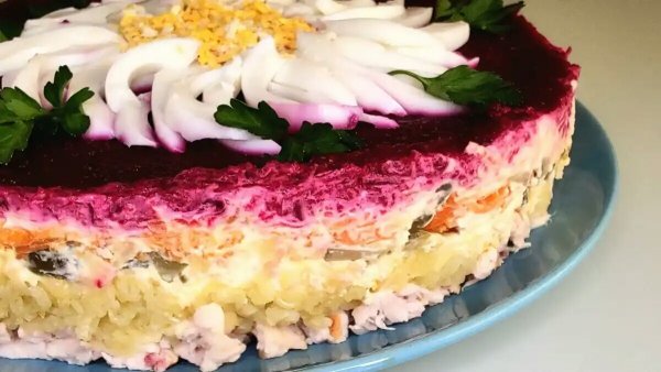 Описание: Салат "Хризантема". Люблю его больше селедки под шубой.Сегодня я готовлю салат - хризантема, это салат на основе копчёной грудки.Такой вариант салата украсит любой праздничный стол и составит достойную конкуренцию всем известным салатам, таким как оливье, мимоза и сельдь под шубой!Процесс приготовления: (список ингредиентов вы можете найти в конце статьи).1. Варю яйца. Отделяю белки от желтков и нарезаю белки на лепестки.2. Натираю желтки на мелкой терке.3.Смешиваю вареную натертую свеклу, чеснок, соль и растительное масло.4. Выкладываю в разъемную форму копченую грудку и смазываю ее майонезом.5.Затем выкладываю натертый вареный картофель и промазываю его майонезом.6.Сверху выкладываю 2/3 натертых желтков и снова добавляю майонез.7. Следующий слой - соленые огурчики. Майонез на этот слой я не добавляю.8. Затем отправляю к салату вареную морковь.9. Смазываю морковь майонезом.10. Завершающим слоем я выкладываю свеклу с чесноком и маслом.11. Затем, в качестве украшения, я выкладываю из белков порезанных на лепестки, цветок в виде большой хризантемы.12. В середину цветка высыпаю оставшуюся одну треть натертых желтков13. Украшаю цветок листиками петрушки. Убираю салат в холодильник для пропитки на некоторое время.14. Аккуратно снимаю разъемную форму15. Подравниваю края салата при помощи ложкиСалат готов! Такой салат прекрасно украсит любой праздничный столПриятного аппетита!Ингредиенты:Копчёное куриное филе - 300 гМорковь отварная - 2 штКартофель отварной - 2 штСвекла отварная - 2 штОгурец солёный - 2-3 штЧеснок - 2-3 зубчикаЯйца - 3 штМайонез - по вкусуРастительное масло - 2 ч.л