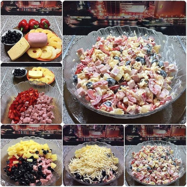 Описание: Ингредиенты:ВетчинаСырАнанасыМаслиныБолгарский перецМайонезПриготовление:Ветчину порезать кубиками. Парочку сладких, болгарских перчиков, так же нарезаем небольшими кубиками. С ананасов слейте сироп. и нарежьте небольшими кусочками. Порежьте маслины. На крупной терке трем сыр. Заправляем майонезом и солим по вкусу.