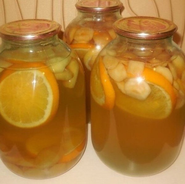 Описание: Компот из яблок, апельсина и лимона домашняя фанта на зиму!Для одной трёхлитровой банки компота понадобится:- яблоки (небольшие) 8-10 шт.;- сахарный песок 300 гр;- вода 2,5 литра;- апельсин 1/2 шт.;- лимон 1/3 шт.Приготовление:Перед началом приготовления компота банки простерилизовать.И так, начнём с того, что под холодной проточной водой вымоем яблоки. Яблочки, кстати, для компота подбираем мелкие. Если у вас крупное яблоко, то на банку заготовки достаточно 2-3 яблока.Апельсины и лимон обязательно нужно ошпарить крутым кипятком, чтобы выделились эфирные масла, содержащиеся в кожуре цитрусовых.Без этой манипуляции готовый компот потом может горчить.Яблоки очищаем от кожуры.Затем, острым ножом удаляем серединки и режем яблоки дольками среднего размера.Апельсины и лимоны нарезаем кольцами толщиной в один сантиметр.Цитрусовые для компота старайтесь выбирать среднего размера, главное, чтобы нарезанные кружочки свободно проходили через горлышко банки.Если апельсины слишком крупные, можно разрезать кружочки пополам. На вкусовые качества компота это не повлияет, но смотреться в банке половинки будут не очень аппетитно.В каждую банку закладываем дольки яблок, три кружочка апельсина и два кружочка лимона.Кипятим нужное количество воды и заливаем банки доверху.Затем, накрываем их стерилизованными крышками и укутываем полотенцем на двадцать минут.Дальше, с помощью специальной крышки с дырочками сливаем воду с бутылей в большую кастрюлю, добавляем сахар и доводим до кипения.Полученный сироп заливаем обратно в банки и закатываем крышками.Дальше, банки с компотом переворачиваем на крышки и укутываем одеялом на два часа.Приятного аппетита!