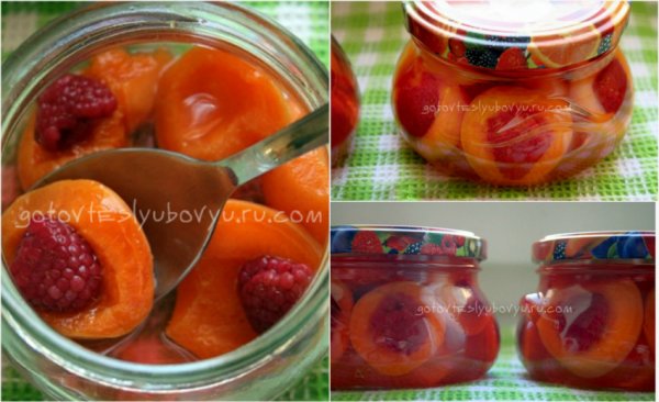 Описание: Абрикосы с малиной в сиропеБаночки потрясающе вкусных абрикосов с малиной в сиропе могут отлично храниться при комнатной температуре всю зиму. Только вопрос в том, смогут ли они дождаться зимы. Плоды и ягоды, насыщенные деликатным сиропом с малиновым ароматом, просто тают во рту. Содержимое баночек идеально подходит для украшения тортов, а сироп – для приготовления десертов или компота в разбавленном виде.Ингредиентыабрикосы мелкие плотные – 800 гягоды малины – 200 гсахар – 300 гсок лимона свежеотжатый – 2 ст. ложкивода – 1 лПриготовлениеДля заготовки указанного количества ингредиентов вам понадобится 4 баночки емкостью 330 мл или 2 – емкостью 500 мл. Банки и крышки хорошо вымойте, стерилизуйте и обсушите.В кастрюлю налейте 1 л воды, поставьте на огонь, добавьте сахар, доведите до кипения, перемешайте и варите до полного растворения сахара.Абрикосы вымойте, разрежьте пополам и удалите косточки. Малину вымойте.В каждую половинку абрикосов вставьте ягоду малины и плотно укладывайте в банки. Постарайтесь укладывать абрикосы срезом к стеклу, чтобы создать красивый эффект ягод малины, обрамленных абрикосами.Уложенные в банки фаршированные малиной абрикосы залейте горячим сахарным сиропом и стерилизуйте в кипящей воде 20-30 минут. Затем плотно укупорьте или закрутите винтовыми крышками и переверните вверх дном до полного остывания.Существует еще один способ стерилизации – в духовке, так называемый сухой. Укупорьте банки крышками, поставьте их в духовку, предварительно разогретую до 100-110 градусов, и выдержите 20-30 минут. Достаньте из духовки и поставьте остывать.Остывшие банки абрикосов с малиной в сиропе уберите на хранение в кладовку с комнатной температурой без попадания прямых солнечных лучей.
